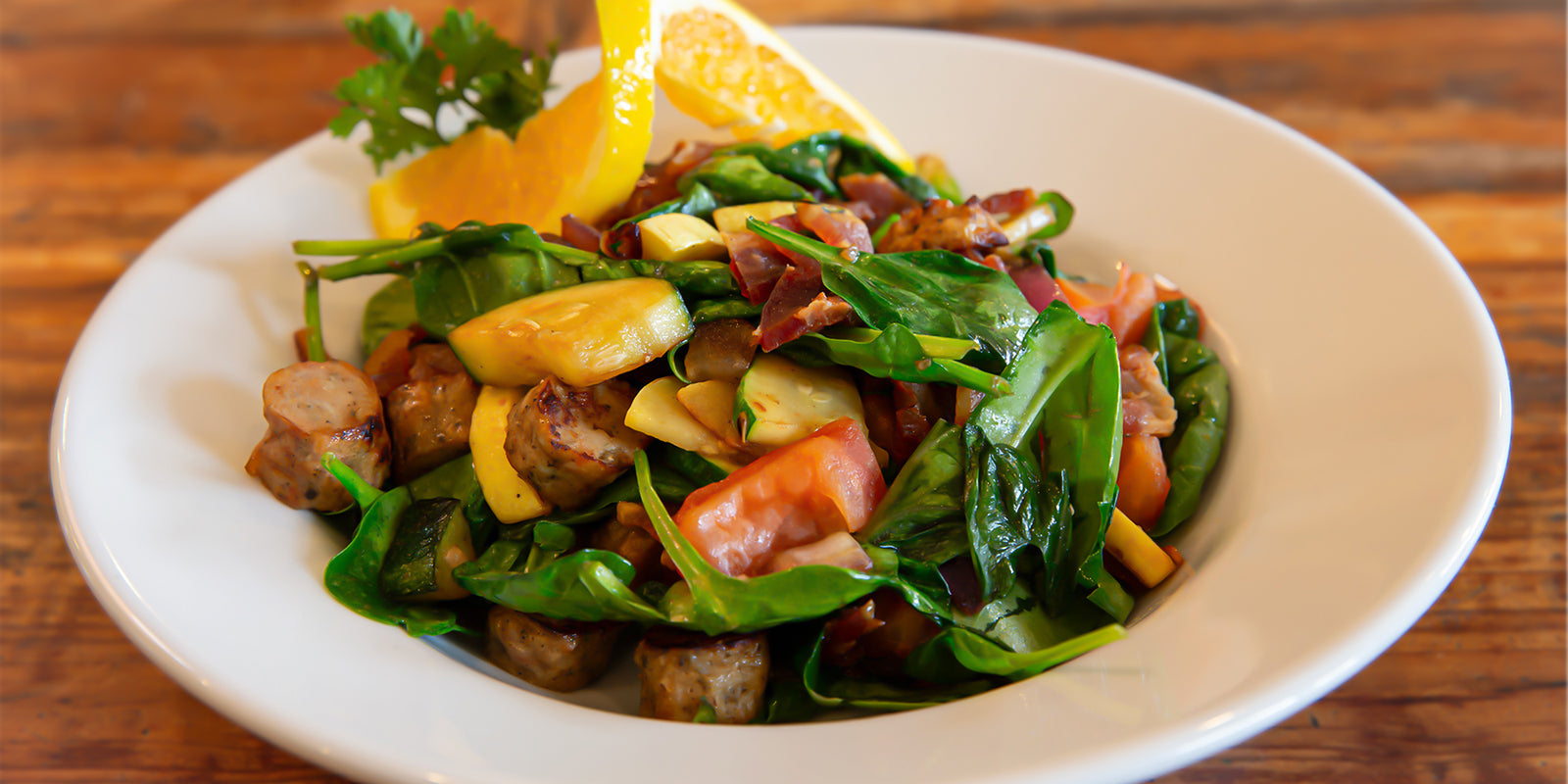 Sauté of Zucchini, Onion, Tomato, Organic Spinach, All Natural Chicken Sausage and Bacon